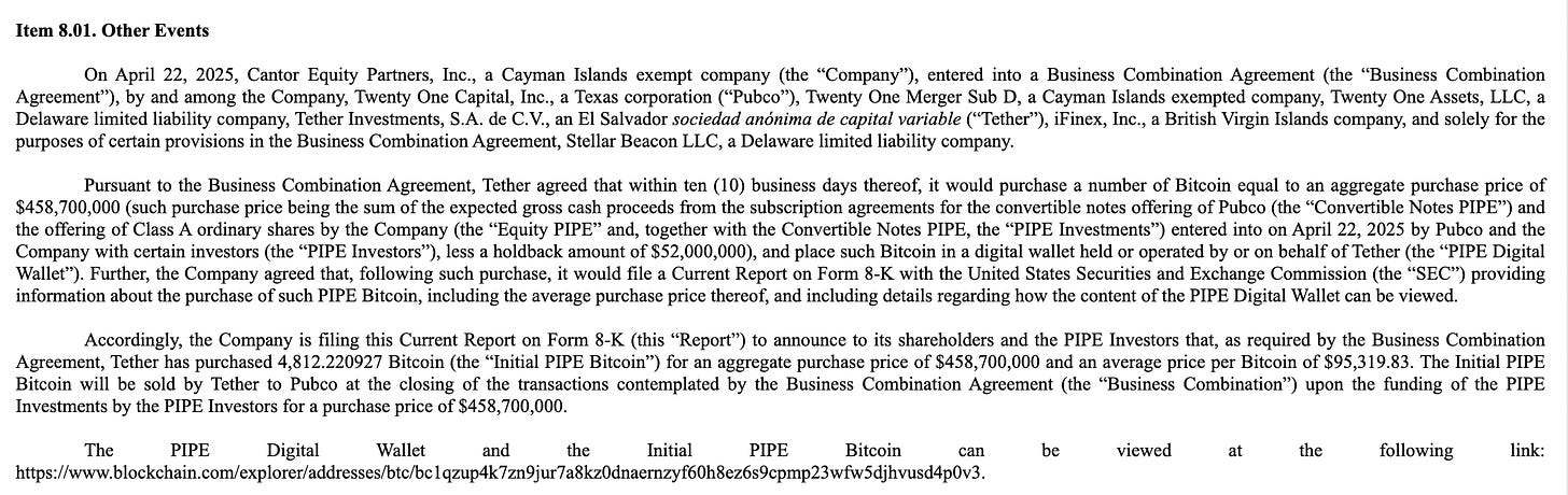 Cantor Equity Partners (CEP) revealed in a new SEC filing that Tether purchased 4,812.2 Bitcoin for $458.7 million on behalf of Jack Mallers’ Bitcoin treasury firm, Twenty One Capital, which plans to go public under the ticker $XXI.