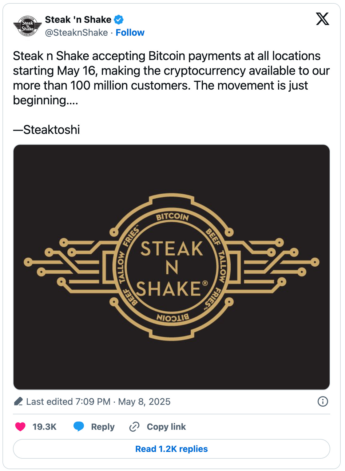 Steak ‘n Shake has confirmed it will begin accepting Bitcoin payments at all 500+ U.S. locations starting next week, following months of cryptic teasers and viral Bitcoin-themed marketing.